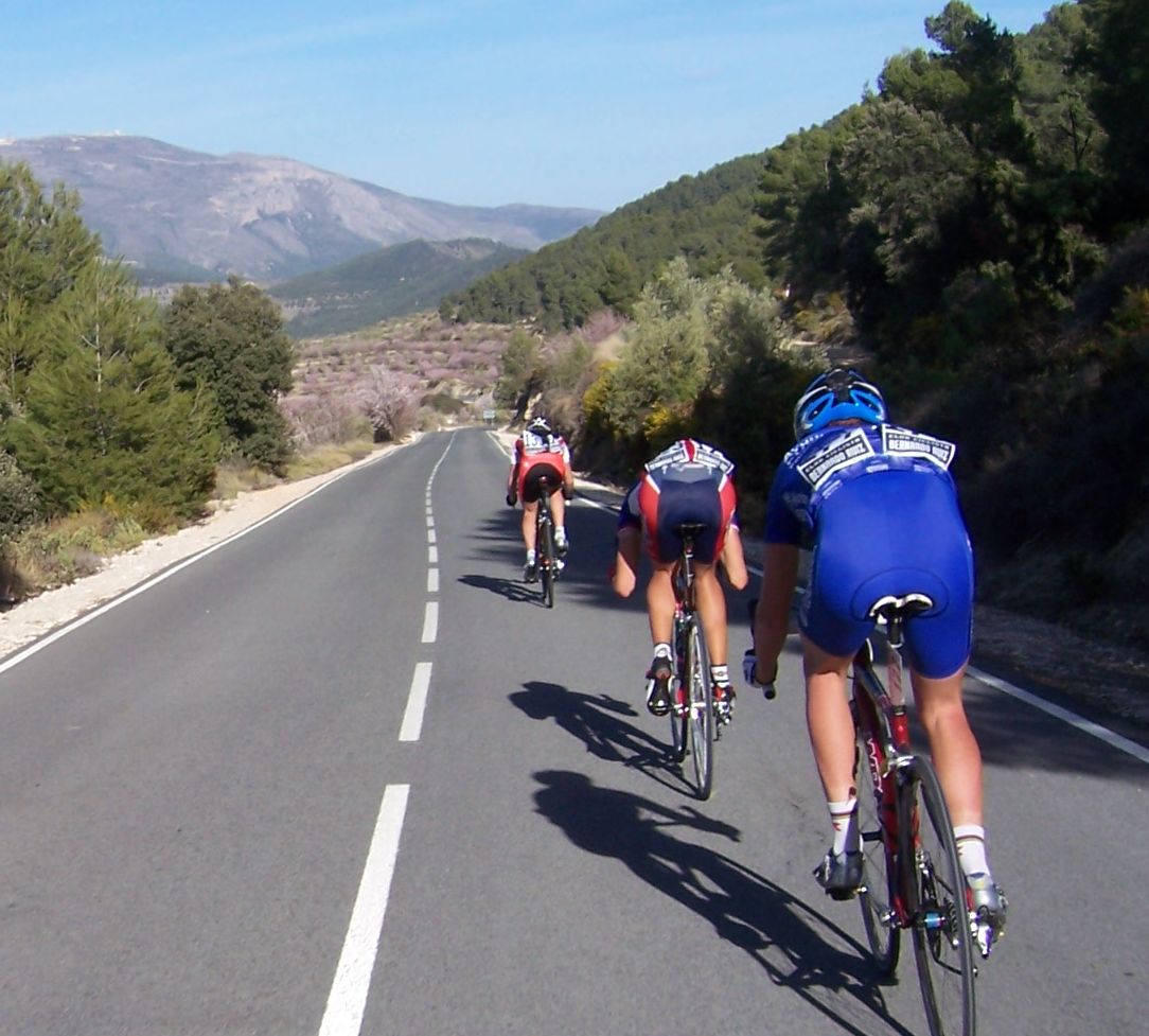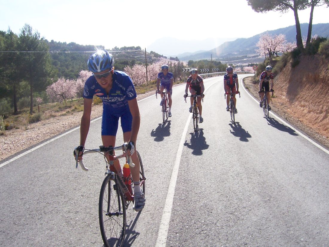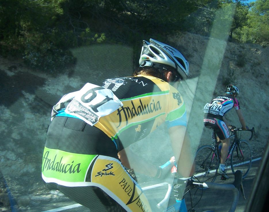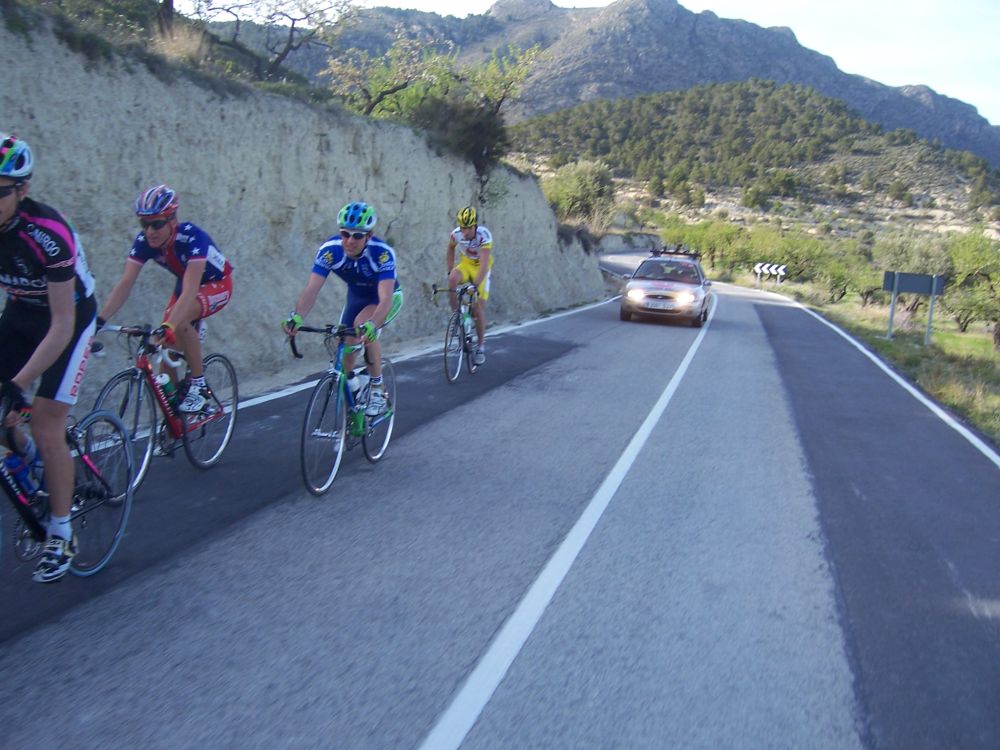 Fuimos encunetados a 60 por hora hasta Albatera, buff como se iba.. en Albatera giramos y comenzamos a subir el puerto del Hondón, aire de cara.. nadie atacaba... todos con el Culote Marron guardando para el puerto, asi que arranqué yo, pero fue un ataque boomerang, volvi para atras por que arrancaron el Culebro, el Padilla.. y ya se enfilo todo... llegamos a las rampas duras y yo ahi me volvi a meter en otro corte, pero las rampas duras se hicieron mas duras y Padilla tensó y ya me abrieron, planté un seto por ahi.. y ya sufri hasta coronar, el paquete se partio pero abajo nos juntamos todos, el sofocón duro poco pero fue horrible, si es que no se puede arrancar ahi...