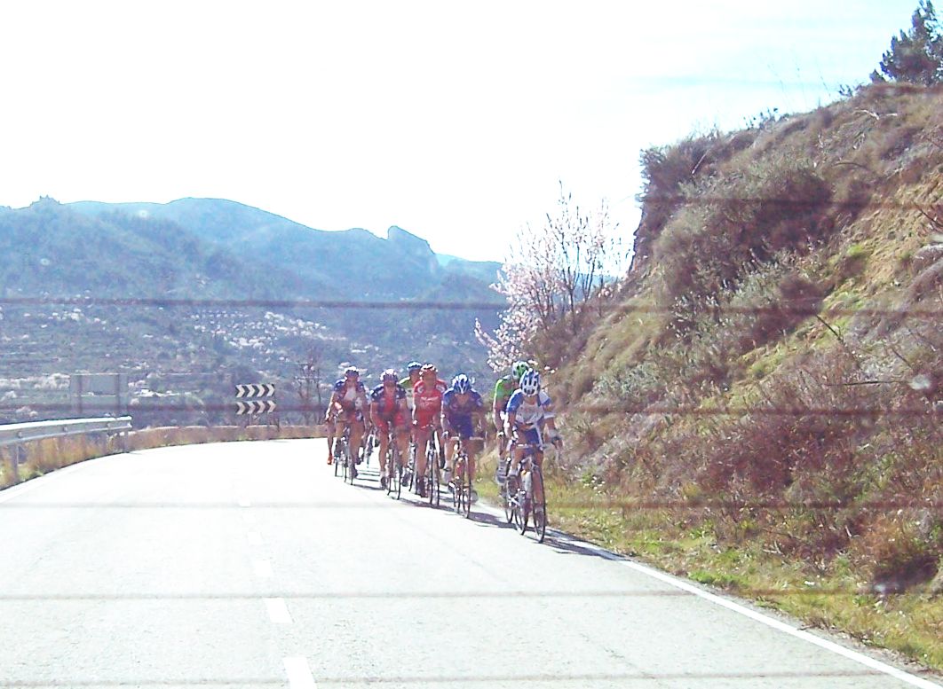 La recta de Castalla a Ibi se hizo infernal, aire de culo por la cuneta, yo iba a rueda viendo las estrellas, el grupo del lider iba a mil por hora, o era yo que iba muy muy tocado, el Xorret del Cati lo habia pasado, pero de una manera que me habia dejado tan tocado que lo iba a pagar en cualquier tachuelina, llegamos a Ibi y empezamos a subir las revueltas, un puerto muy facil pero yo no tenia capacidad de reacción, iba eliminado, iba a rueda del grupo pero se cortó y y segui a rueda, no pude saltar para cortar el hueco, asi que ahi nos quedamos un grupillo de 10 o asi. Coronamos Revueltas y teniamos la fila de los coches cerca pero acabaron desapareciendo.