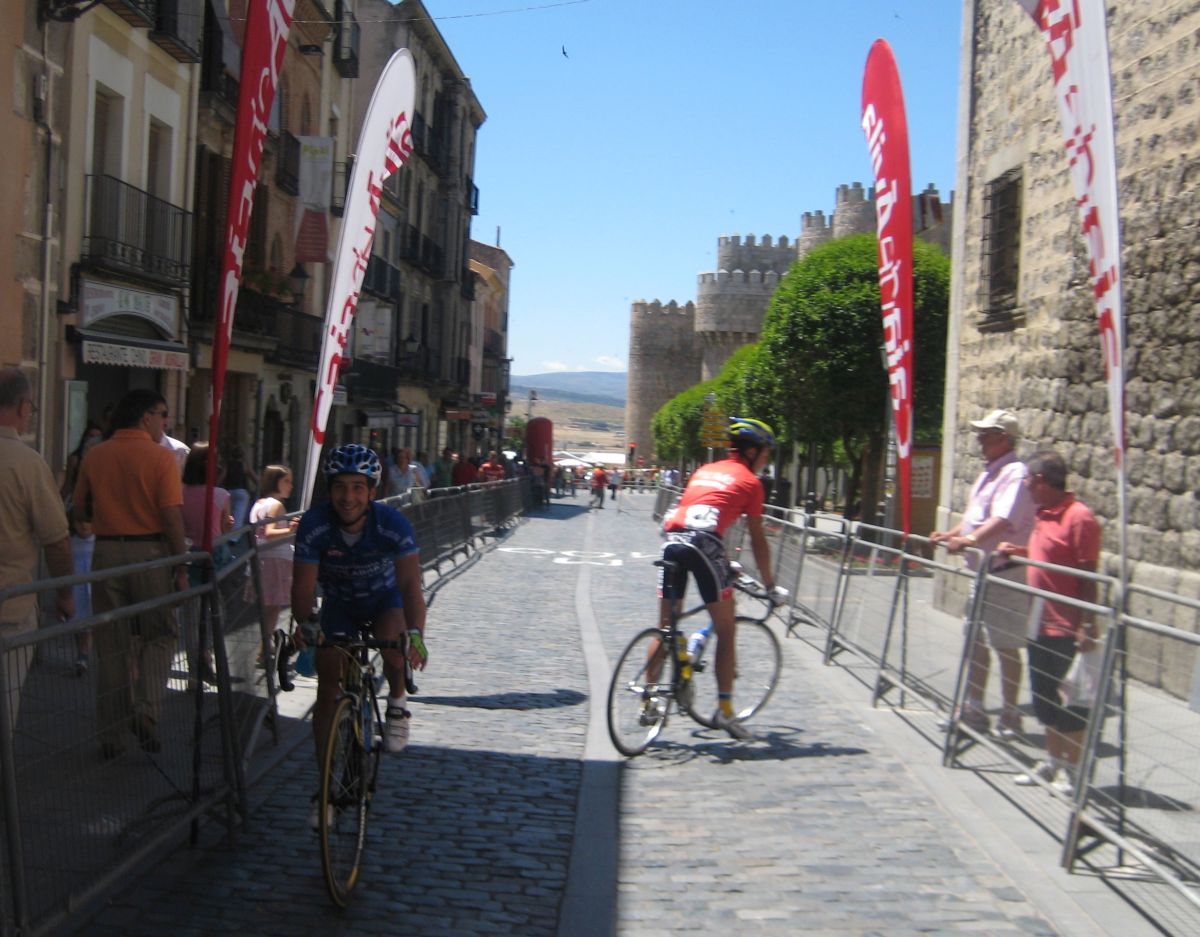 Hago la primera recta adoquinada, impresionante el ambiente, muchisimo público en Avila, giro izquierdas, durisima rampa de adoquines, nuevo giro derechas, yo solo, empiezo a oir poco a poco pedaleos por detrás, ya vienen los lobos, ya estan ahí.