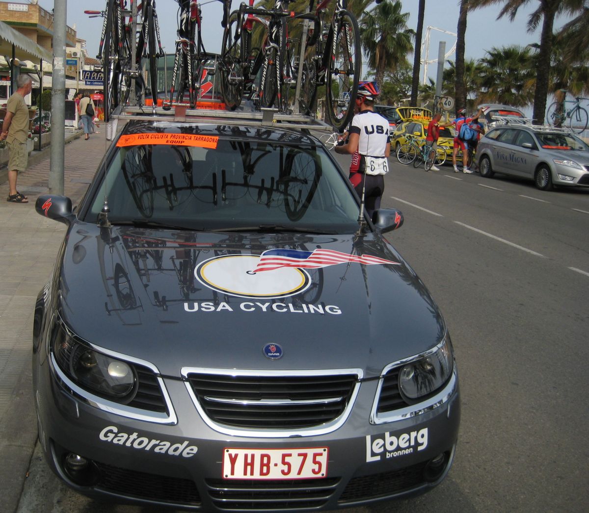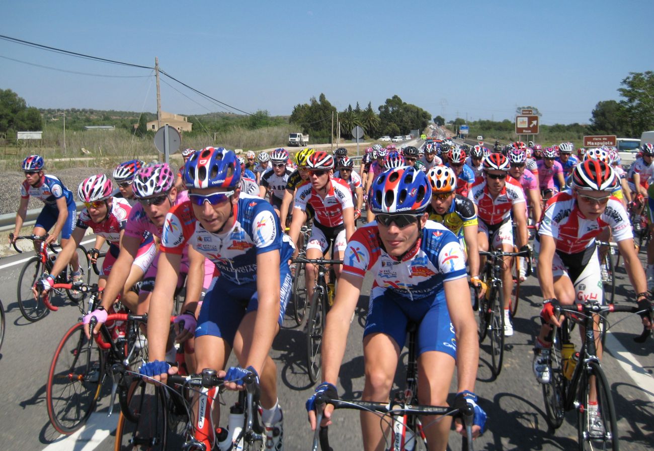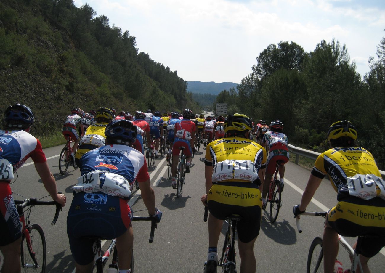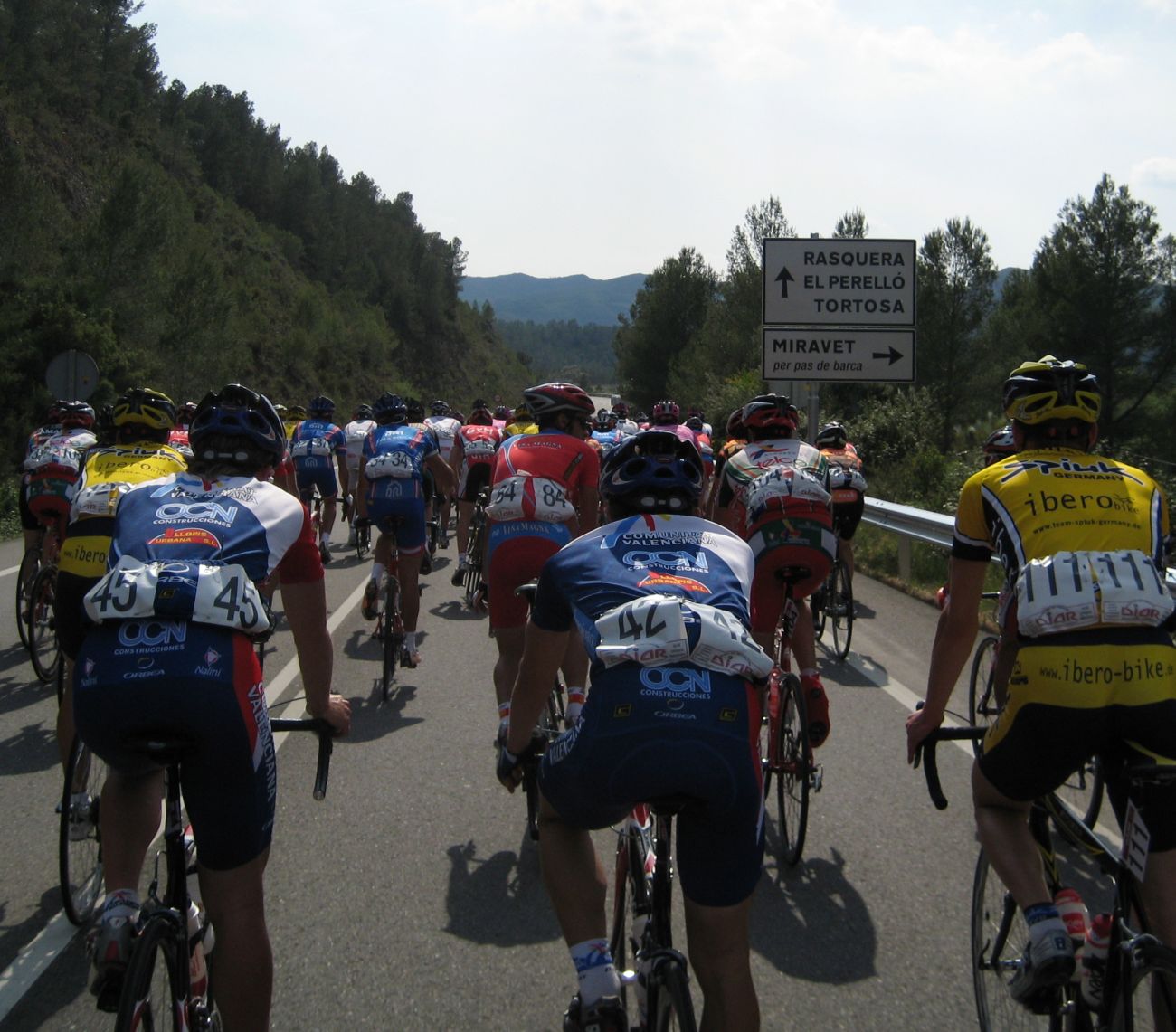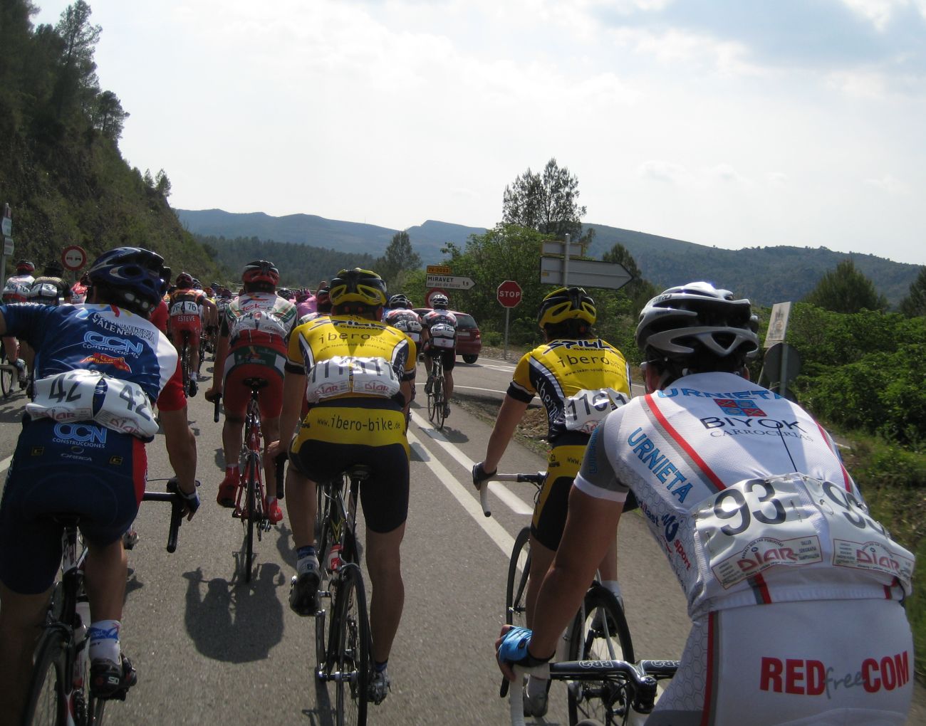 La bajada no se terminaba, horrible, que dolor de riñones, por fin llegamos a los falsos llanos, terreno favorable, me pasó Cariñena bajando, cogi rueda de coches, la caravana y volví a entrar en el pelotón, que se había fracturado.
