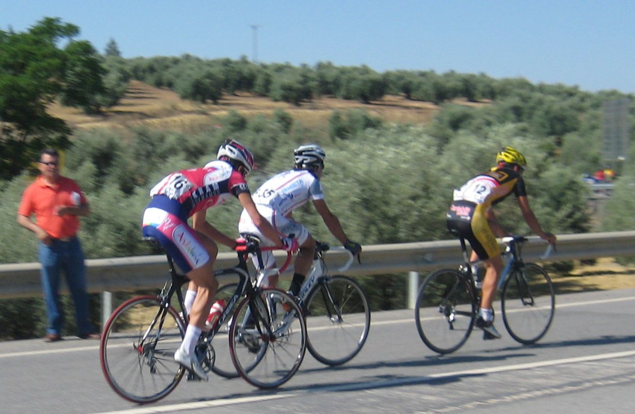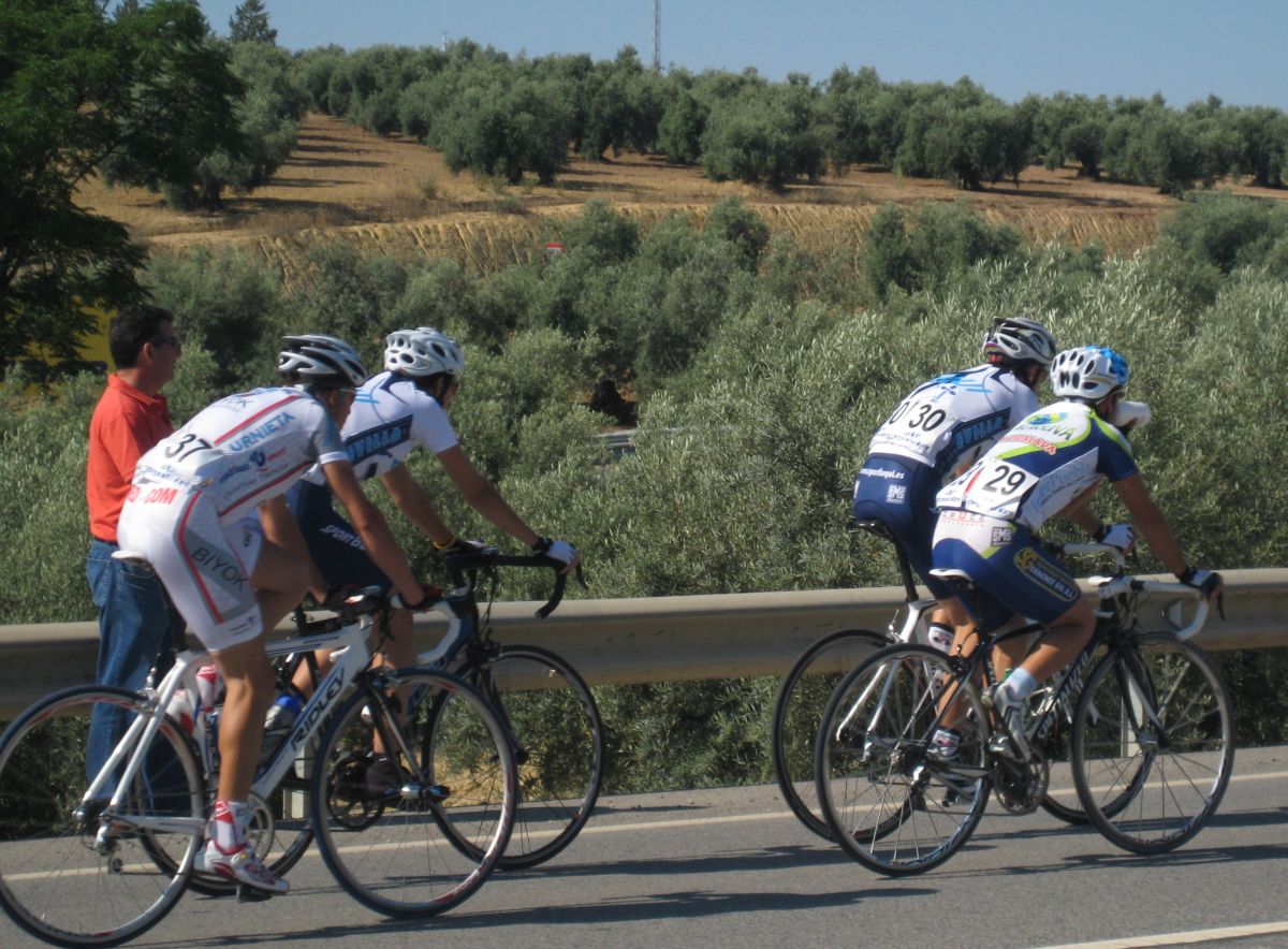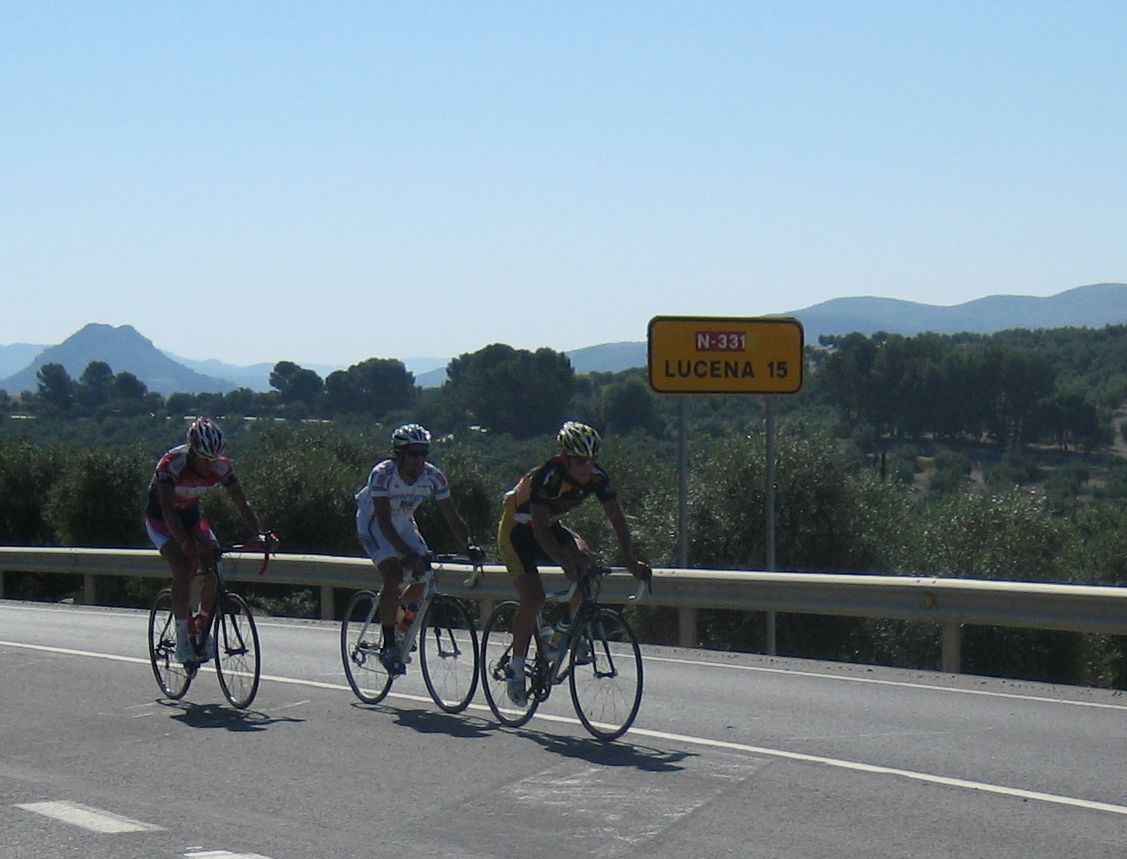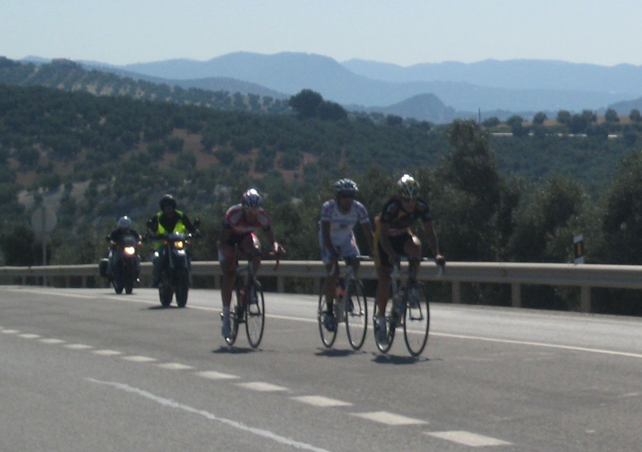 Km 0, primeros ataques, yo metiendome en los cortes sin que me de el aire, hasta que ya me toca mover ficha y me voy solo con el Torralbo, el paisano, ahí vamos los dos abriendo hueco hasta que llegan por detrás otros dos hombres, el Lucentino del Urnieta Saul y Jose Aguilar, ya eramos cuatro, los cuatro a relevos parecía que tenía futuro la cosa, de hecho abrimos bastante hueco pero el pelotón no andaba para regalar cosas y fuimos neutralizados en una bajada, en la vieja nacional de Malaga, camino de Encinas Reales.