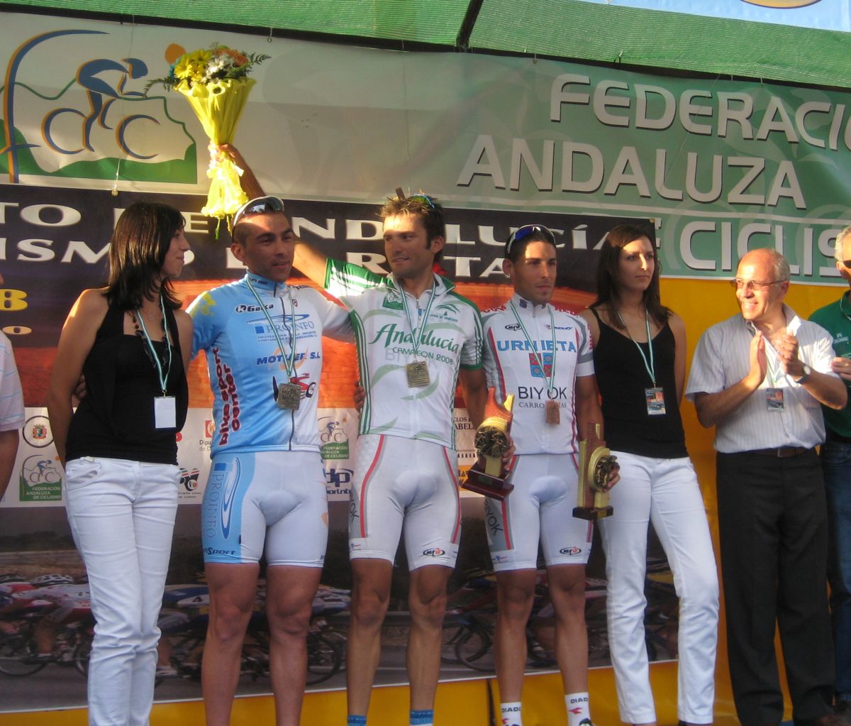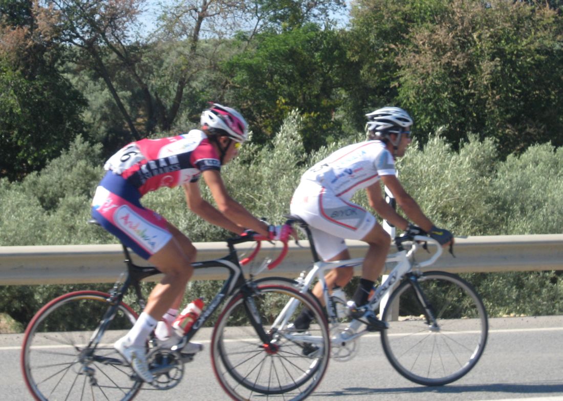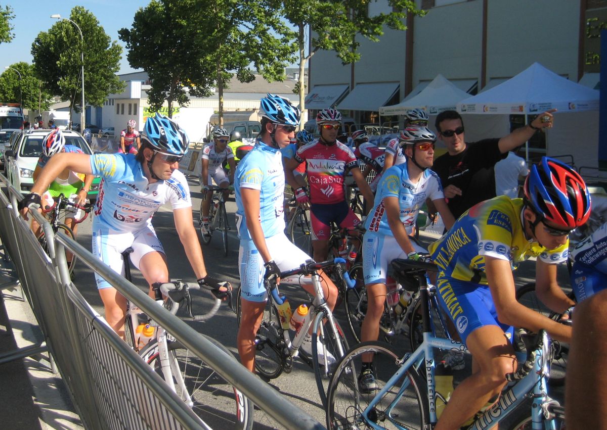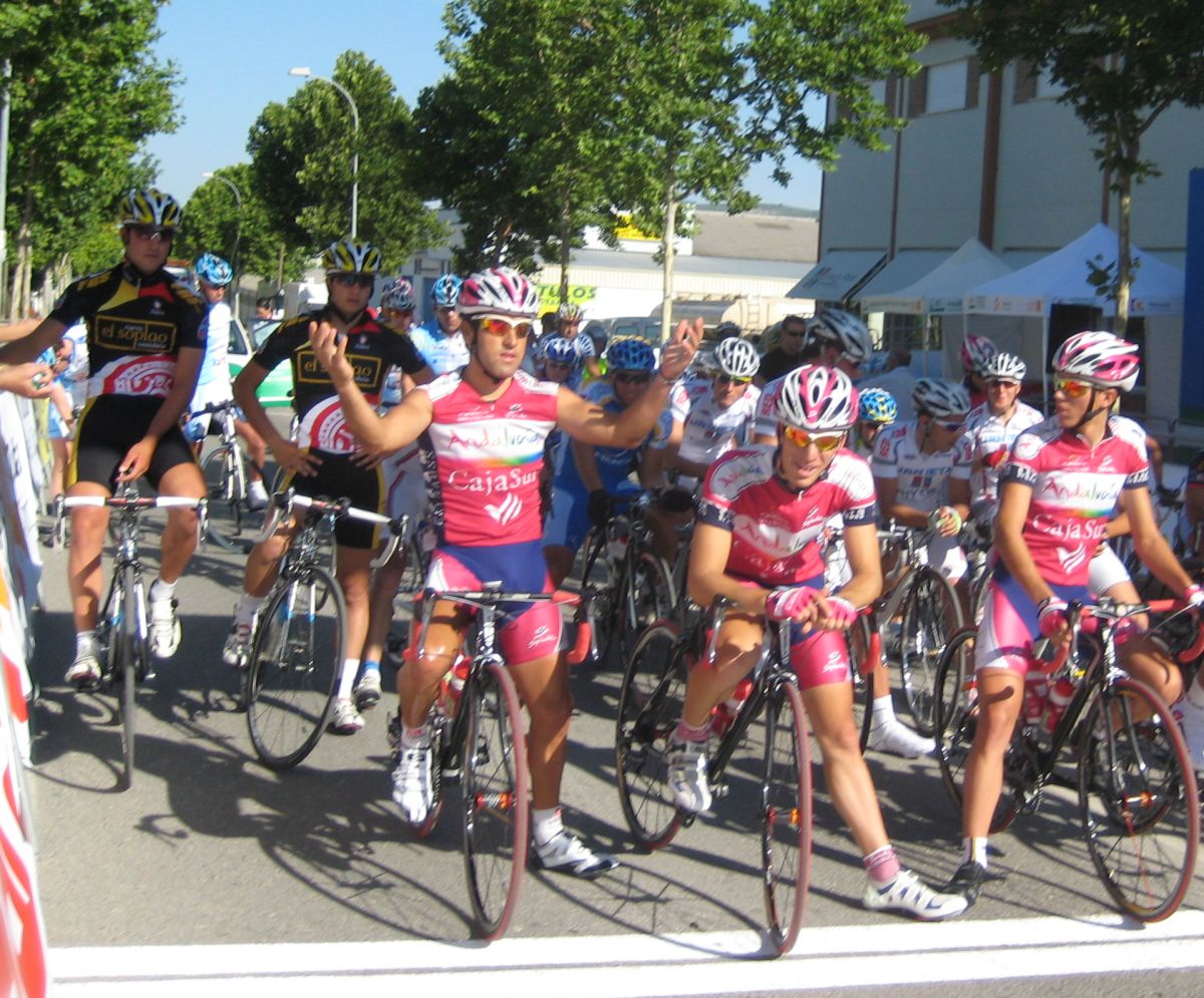 Km 0, primeros ataques, yo metiendome en los cortes sin que me de el aire, hasta que ya me toca mover ficha y me voy solo con el Torralbo, el paisano, ahí vamos los dos abriendo hueco hasta que llegan por detrás otros dos hombres, el Lucentino del Urnieta Saul y Jose Aguilar, ya eramos cuatro, los cuatro a relevos parecía que tenía futuro la cosa, de hecho abrimos bastante hueco pero el pelotón no andaba para regalar cosas y fuimos neutralizados en una bajada, en la vieja nacional de Malaga, camino de Encinas Reales.