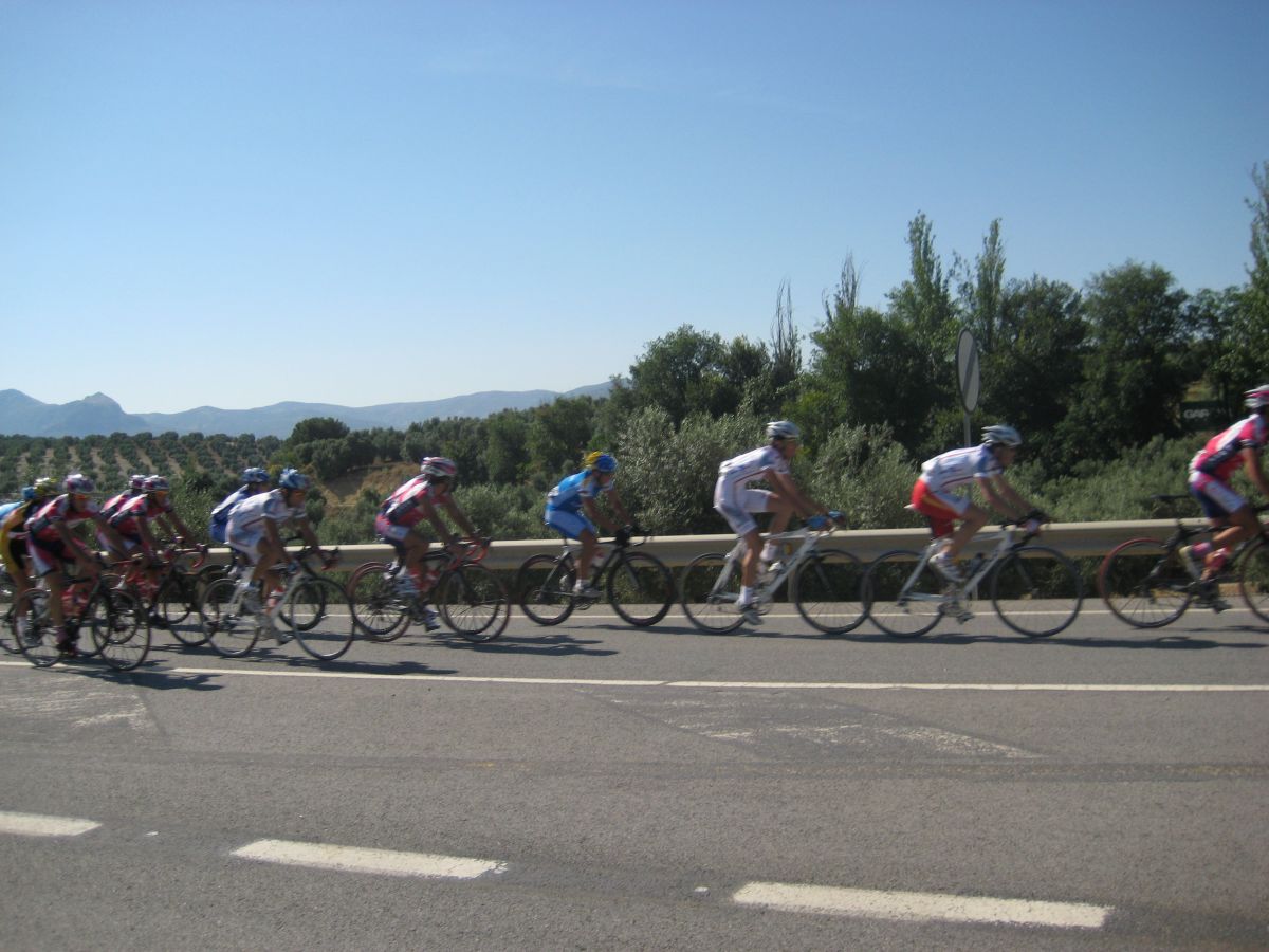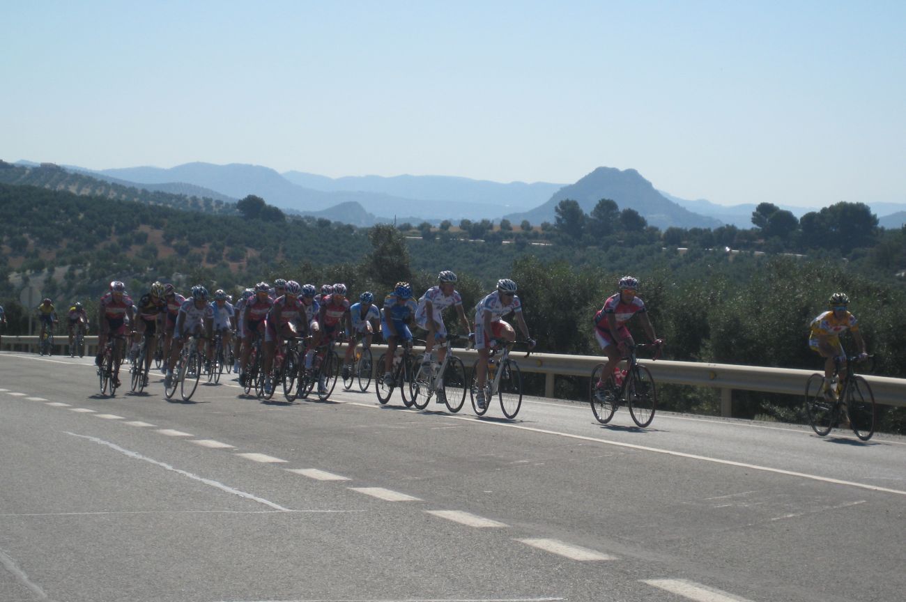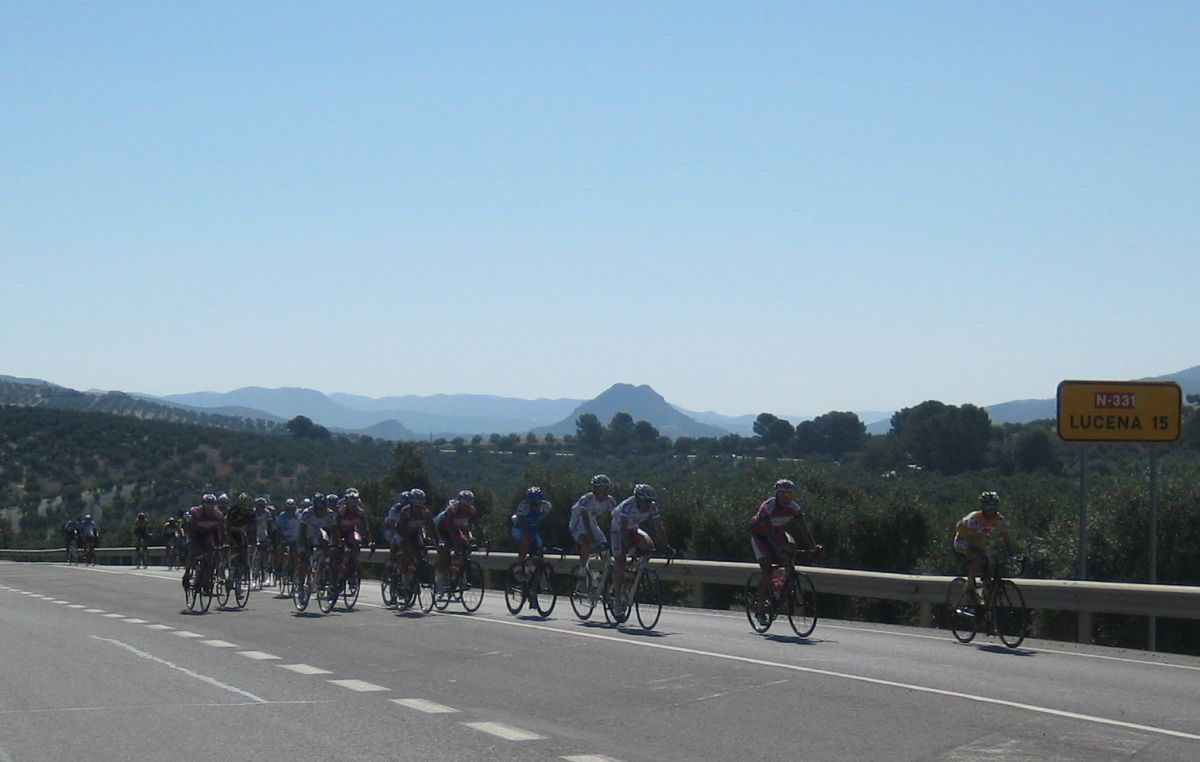 Por detrás también se había cortado la cosa, iba un grupito con los dos Soplaos, tres Cajasur y el Cito, nos acercabamos al punto fuerte del día, el Puerto del Mojón, el aperitivo de la subida a la Virgen de Cabra, pero hasta alli arriba no subíamos, con el Mojón teníamos bastante y seguiríamos por la nacional camino de Lucena.