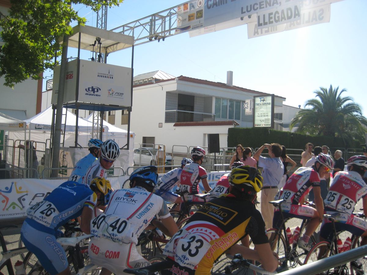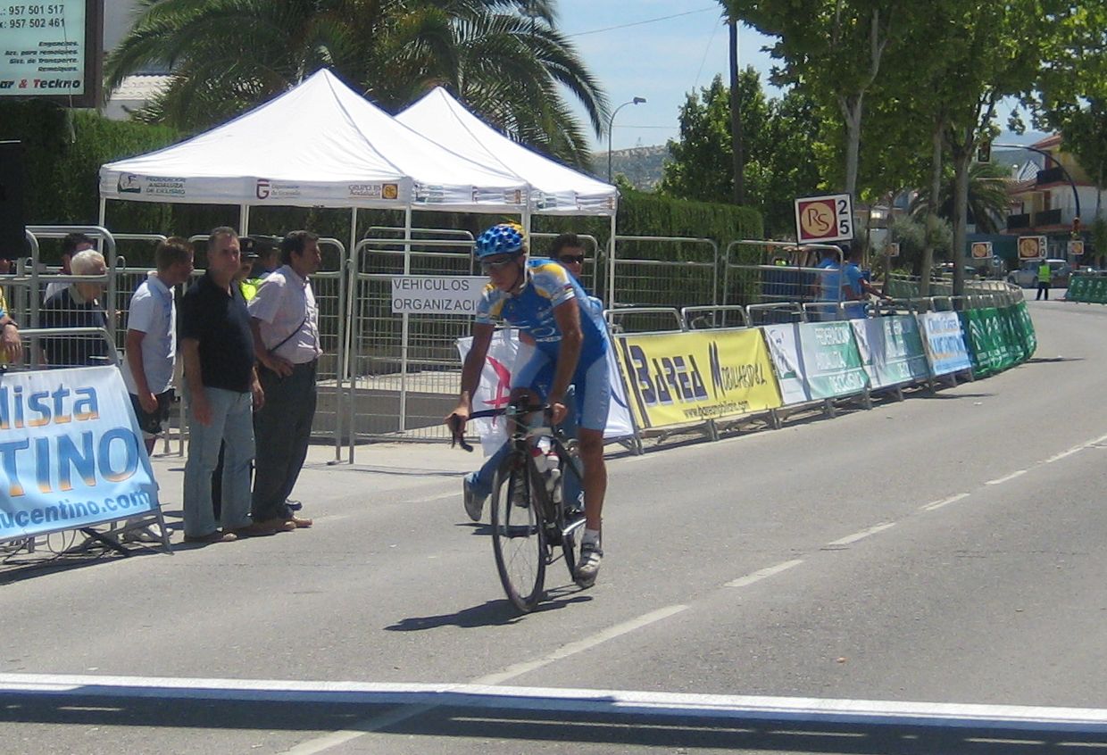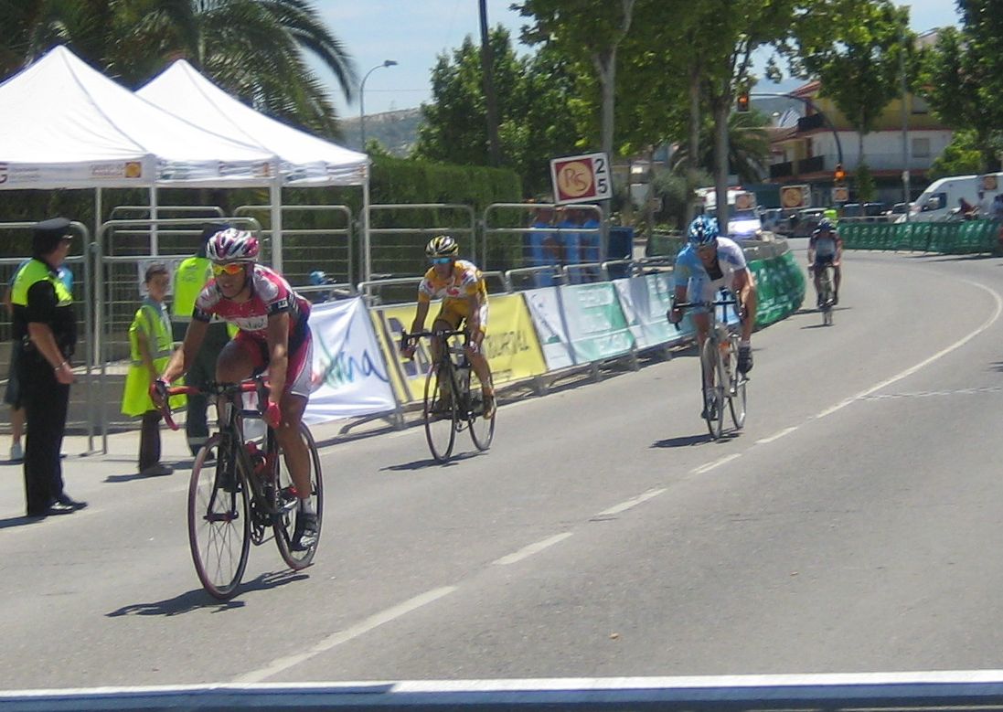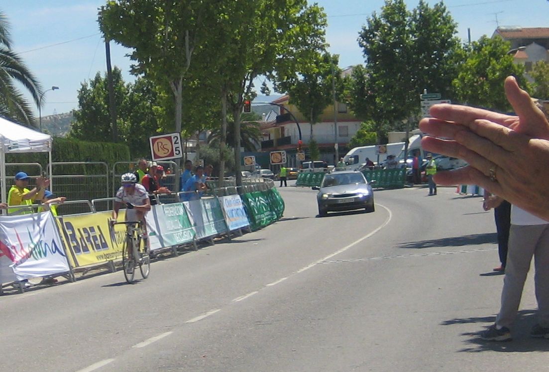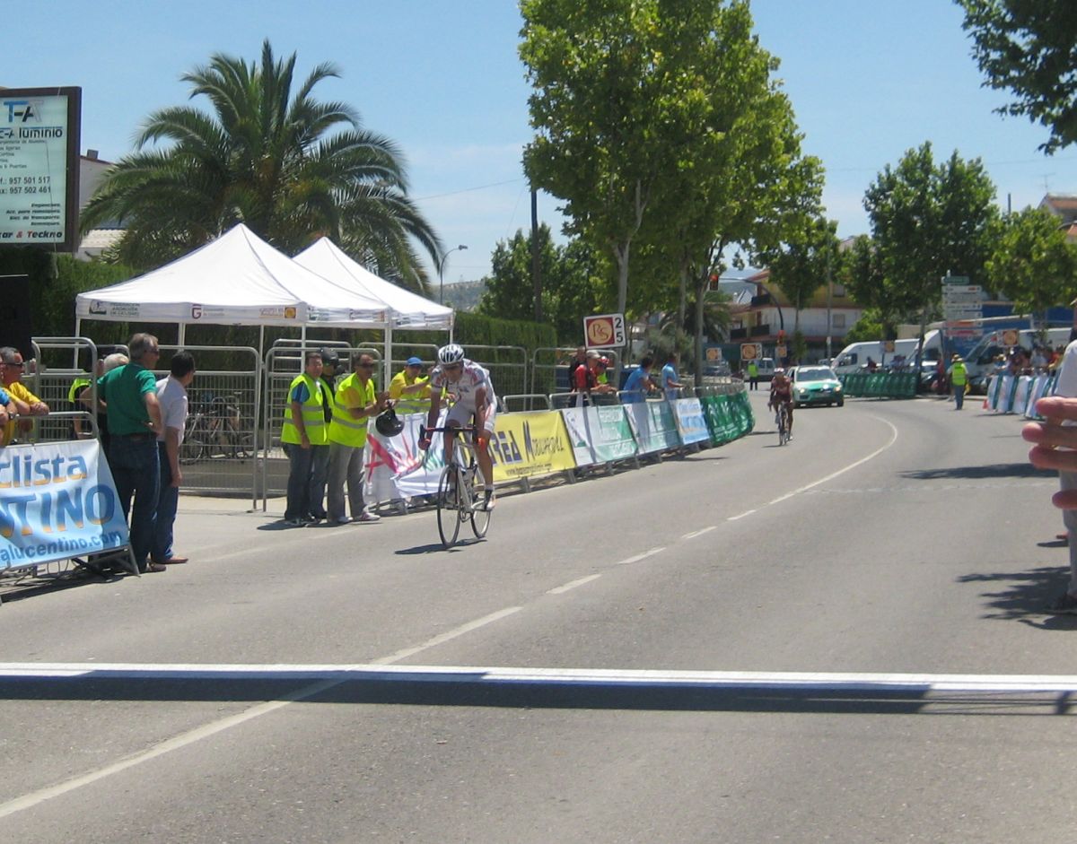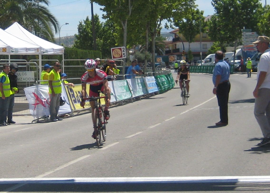 Ultima recta antes de la llegada a Lucena, sabía que iba a cogerles, pero Ignacio me dijo, regula un poco antes de pillarles y les atacas cuando llegues, eso hize, levanté un poco el pie y cuando los pillé arranqué y me fui solo otra vez por delante. Montenegro tuvo que ponerse a tirar a bloque a por mi, fue una persecución Montenegro-Diegoweb, con Saul a rueda de Montenegro, estuvo muy ajustada la cosa, pero apreté con cojones y pude llegar a Meta, entrando tercero de la carrera, segundo Elite, Saul pudo aprovecharse del trabajo de Montenegro para ganarle el sprint, salió bien la jugada, quizas si me quedo a rueda nos gana Montenegro el sprint a los dos, ya sabemos que el Tucho es esprinter.