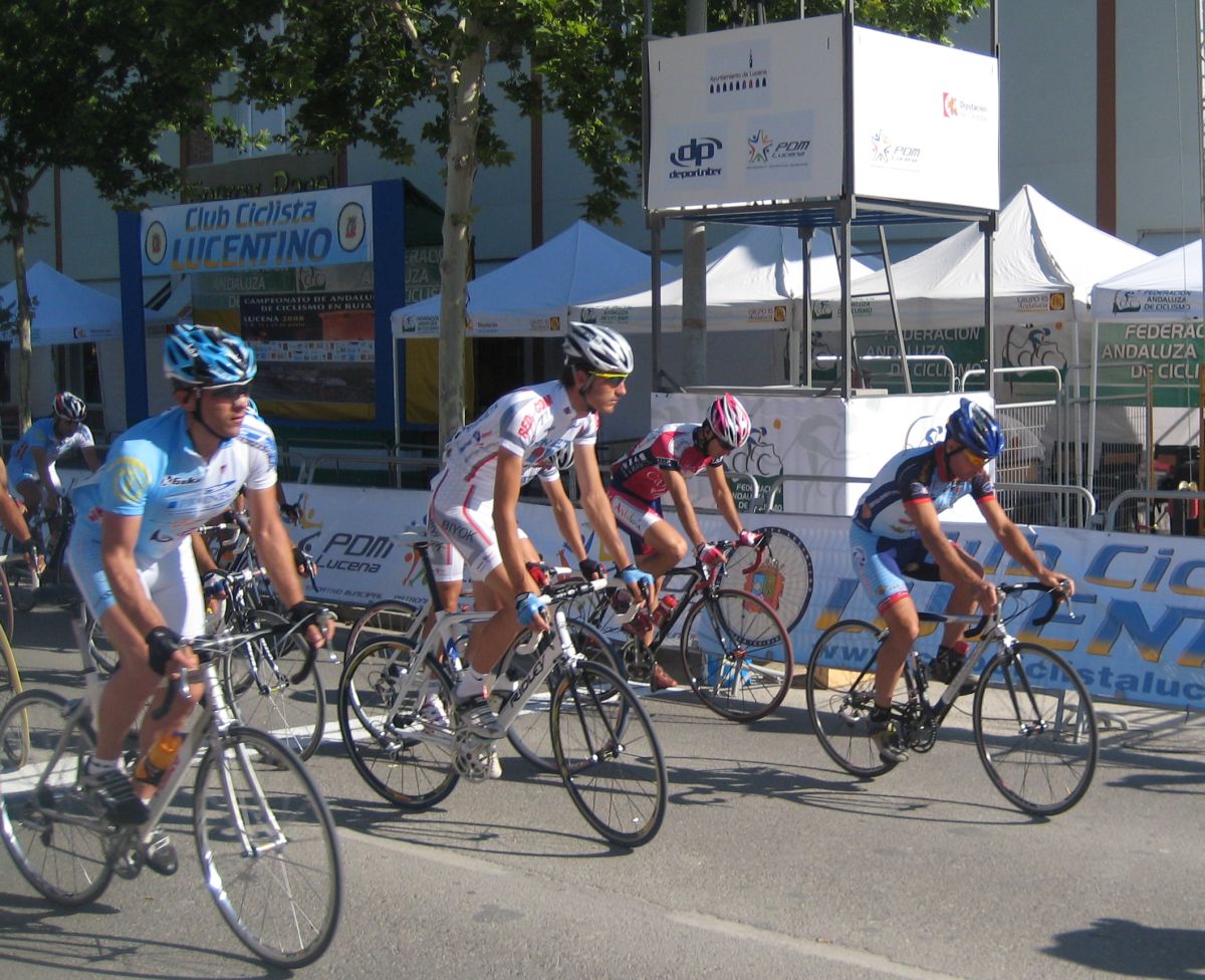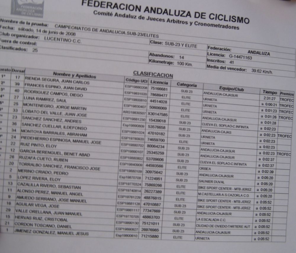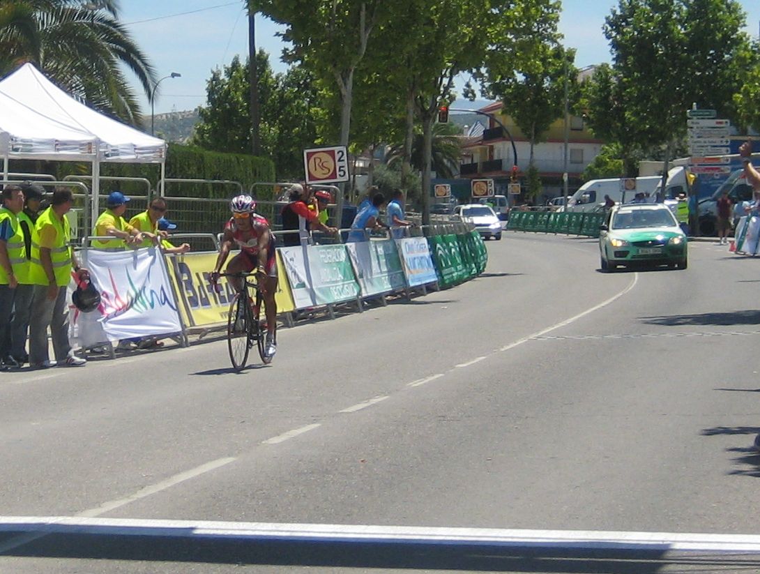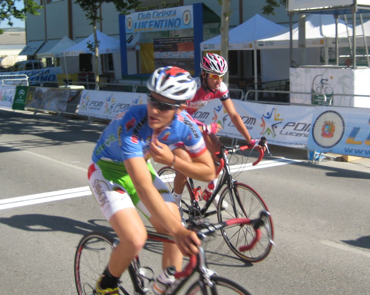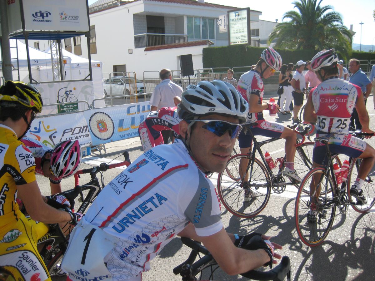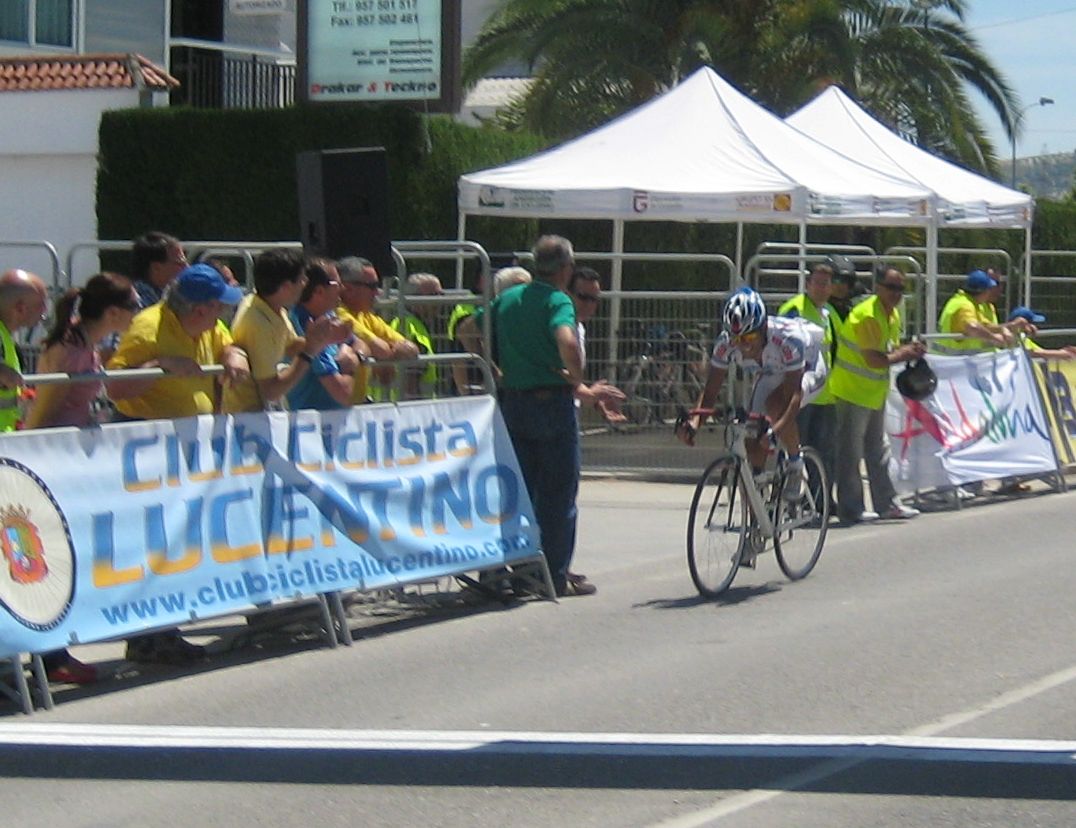Ultima recta antes de la llegada a Lucena, sabía que iba a cogerles, pero Ignacio me dijo, regula un poco antes de pillarles y les atacas cuando llegues, eso hize, levanté un poco el pie y cuando los pillé arranqué y me fui solo otra vez por delante. Montenegro tuvo que ponerse a tirar a bloque a por mi, fue una persecución Montenegro-Diegoweb, con Saul a rueda de Montenegro, estuvo muy ajustada la cosa, pero apreté con cojones y pude llegar a Meta, entrando tercero de la carrera, segundo Elite, Saul pudo aprovecharse del trabajo de Montenegro para ganarle el sprint, salió bien la jugada, quizas si me quedo a rueda nos gana Montenegro el sprint a los dos, ya sabemos que el Tucho es esprinter.