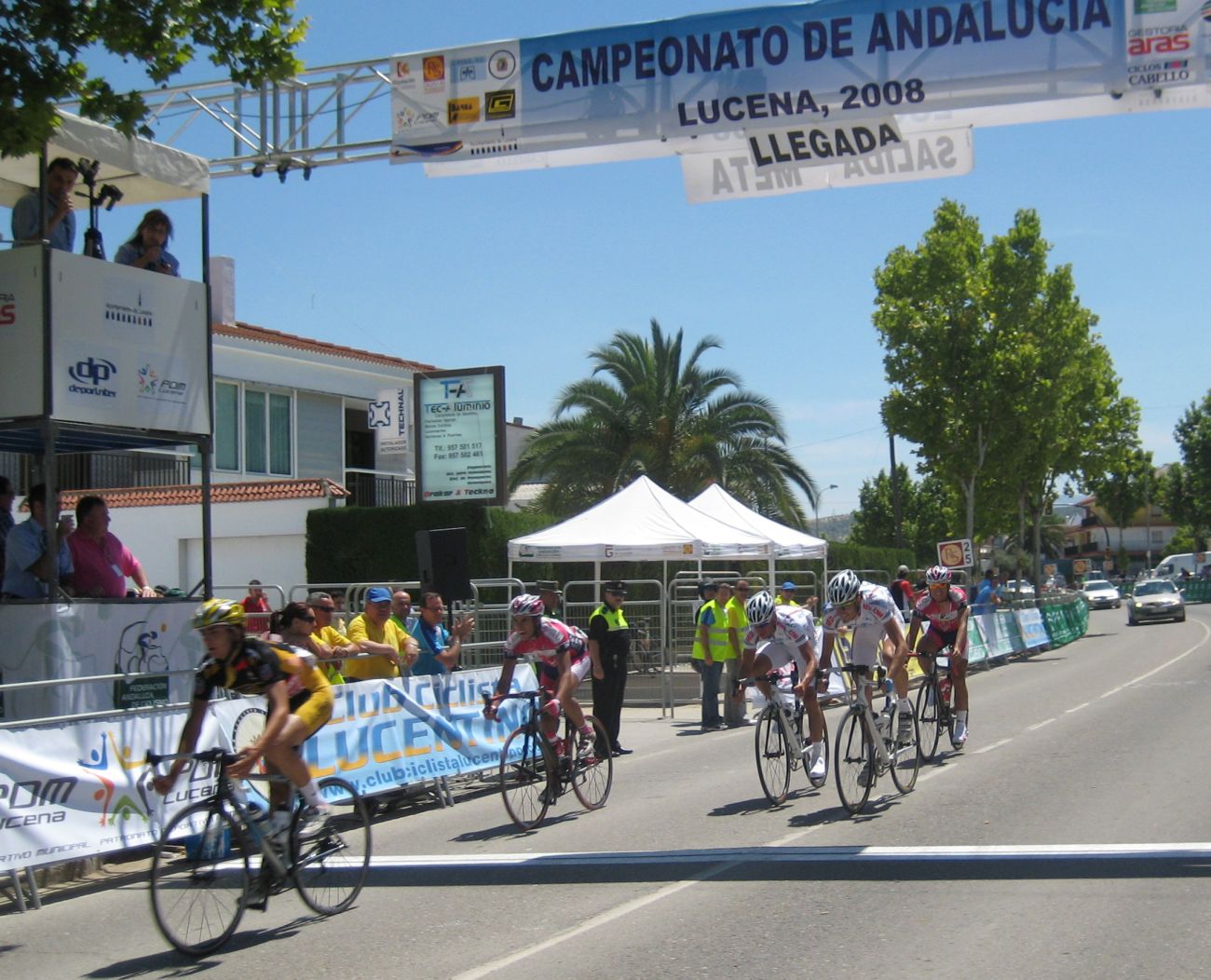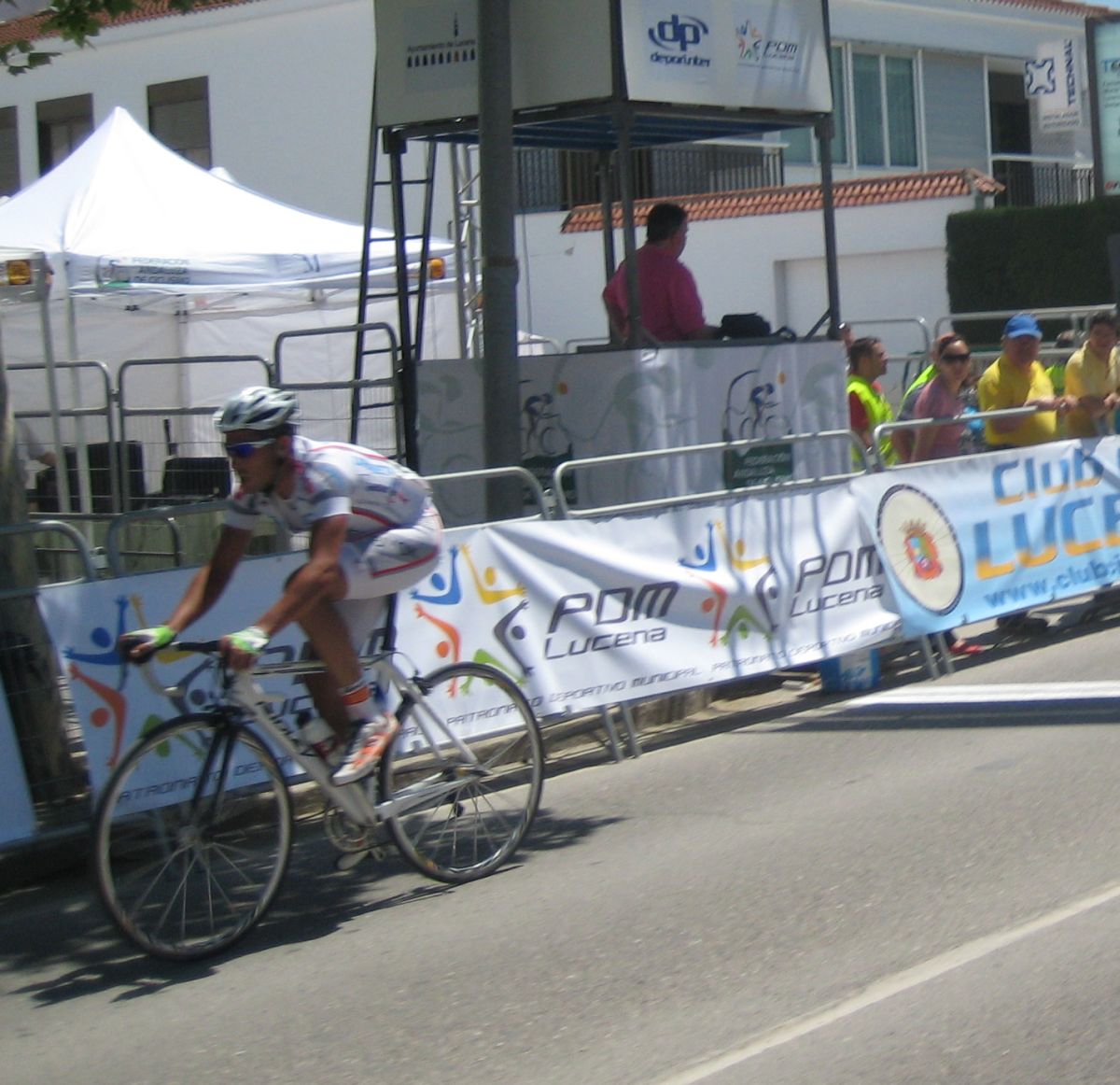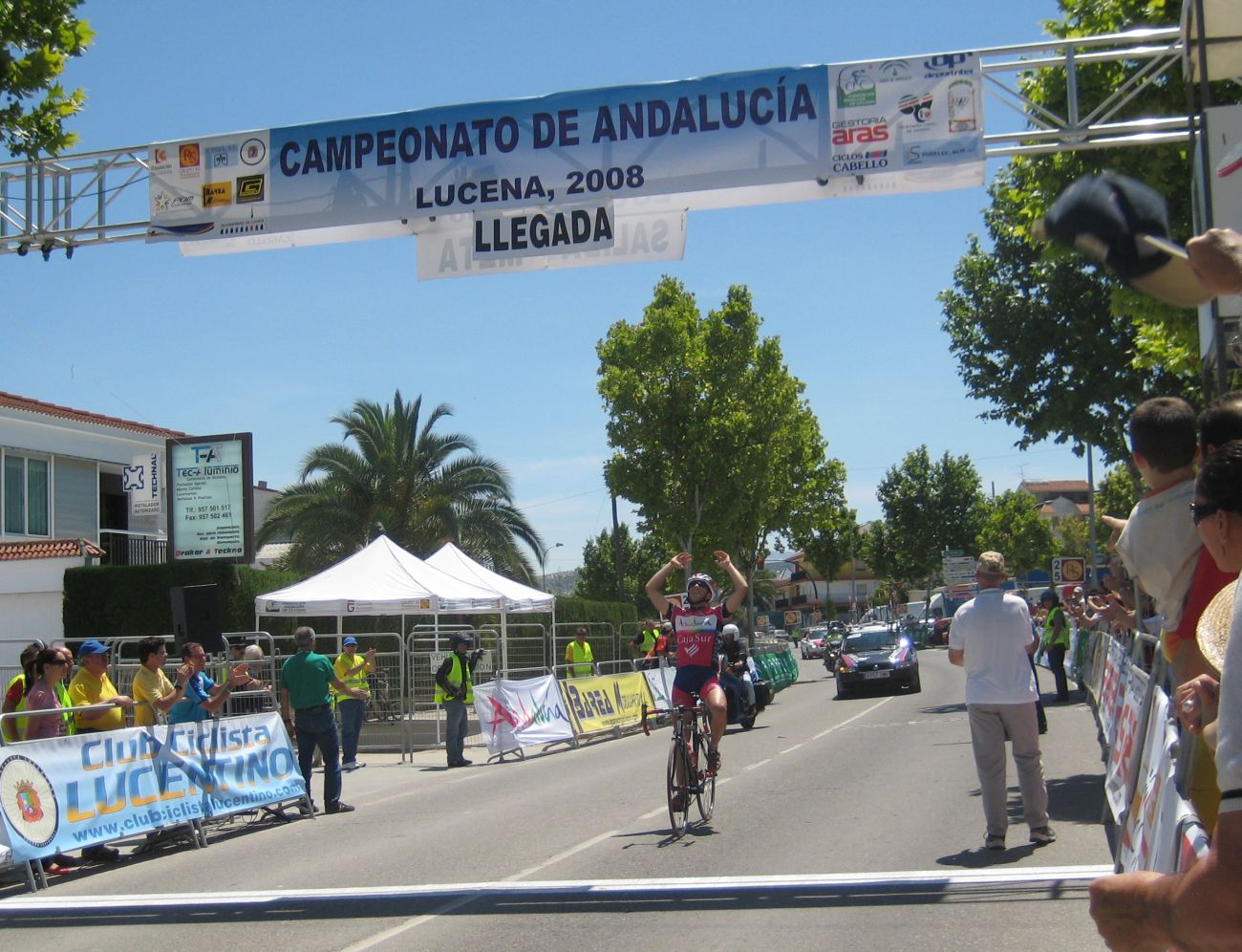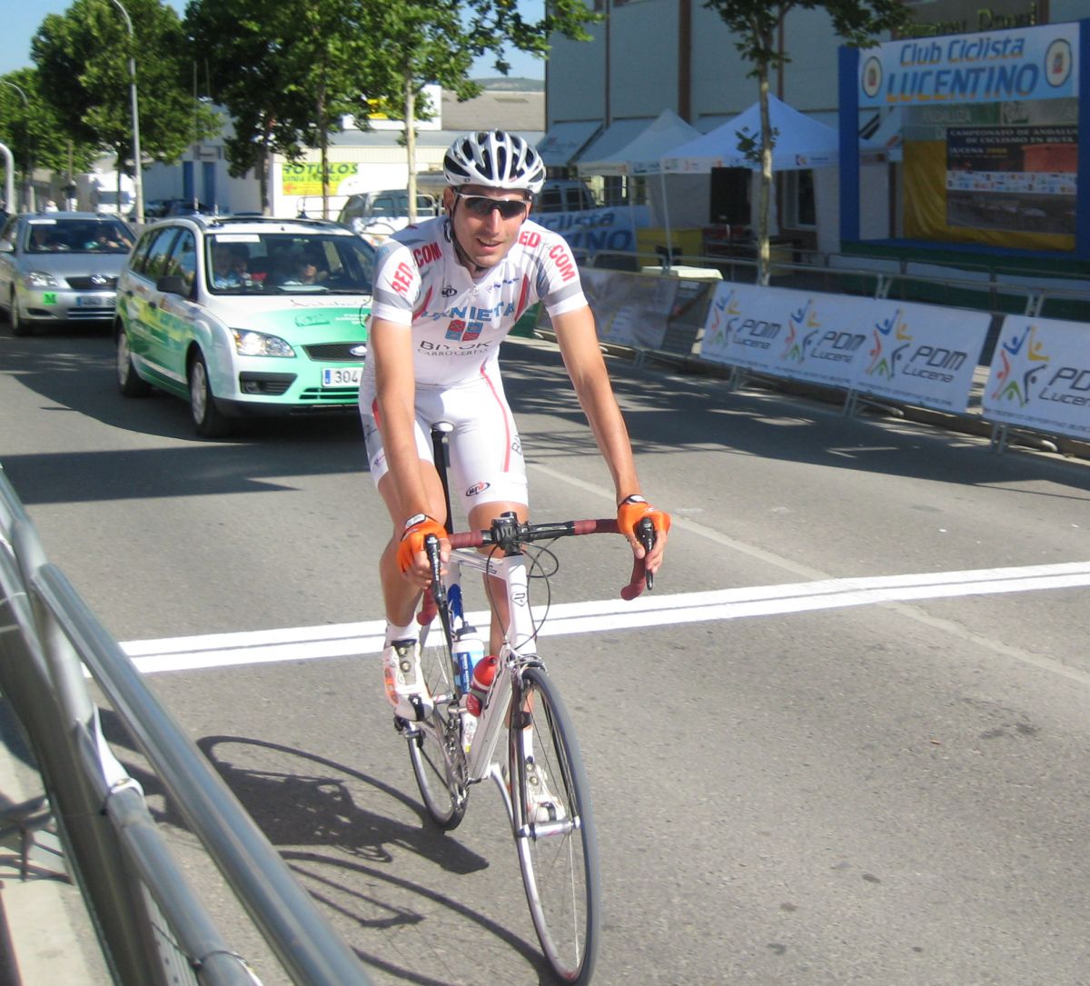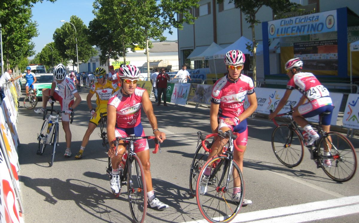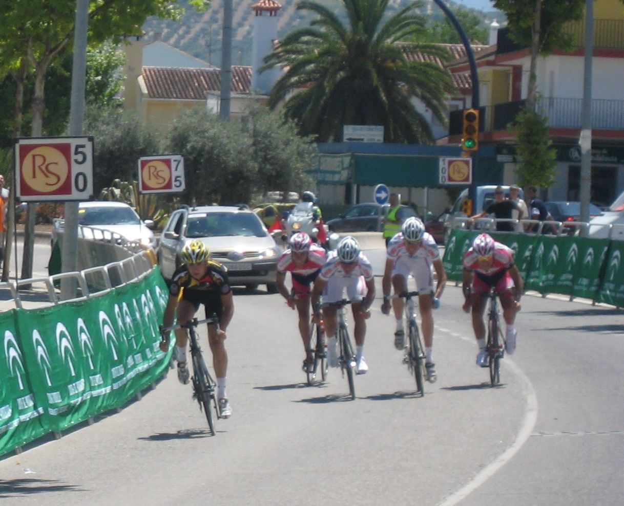 Ultima recta antes de la llegada a Lucena, sabía que iba a cogerles, pero Ignacio me dijo, regula un poco antes de pillarles y les atacas cuando llegues, eso hize, levanté un poco el pie y cuando los pillé arranqué y me fui solo otra vez por delante. Montenegro tuvo que ponerse a tirar a bloque a por mi, fue una persecución Montenegro-Diegoweb, con Saul a rueda de Montenegro, estuvo muy ajustada la cosa, pero apreté con cojones y pude llegar a Meta, entrando tercero de la carrera, segundo Elite, Saul pudo aprovecharse del trabajo de Montenegro para ganarle el sprint, salió bien la jugada, quizas si me quedo a rueda nos gana Montenegro el sprint a los dos, ya sabemos que el Tucho es esprinter.